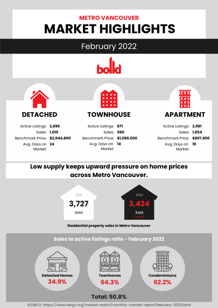 The Real Estate Board of Greater Vancouver (REBGV) reports that residential home sales in the region totaled 3,424 in February 2022, an 8.1 percent decrease from the 3,727 sales recorded in February 2021, and a 49.8 percent increase from the 2,285 homes sold in January 2022.