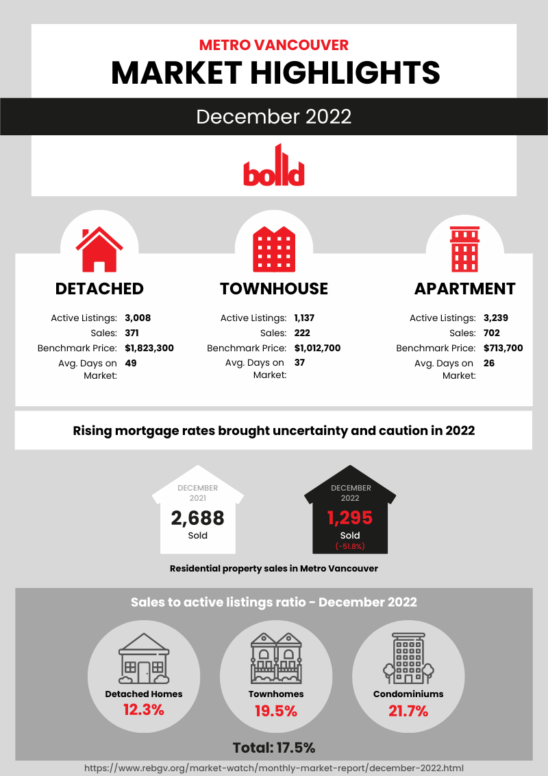 In 2022, Metro Vancouver's housing market took a cautious approach due to the rise in borrowing costs caused by the Bank of Canada's ongoing fight with inflation. According to the Real Estate Board of Greater Vancouver (REBGV), residential home sales in the area totalled 28,903, which is a 34.3% drop from the 43,999 sold in 2021 and a 6.6% dip from 30,944 homes bought in 2020 - far lower than the record sales witnessed during the previous year.