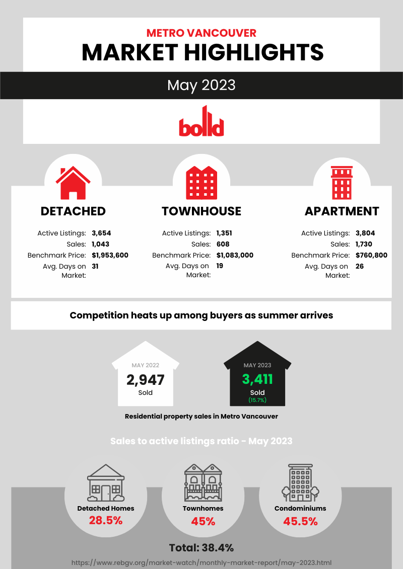 Although the year started slower than usual, the Real Estate Board of Vancouver has announced that the Metro Vancouver housing market is steadily picking up as we approach the summer months. This May, the region saw 3,411 residential home sales, a 15.6 percent increase from the 2,947 sales recorded in May of last year, and a 1.4 percent decline from the 10-year seasonal average of 3,458.