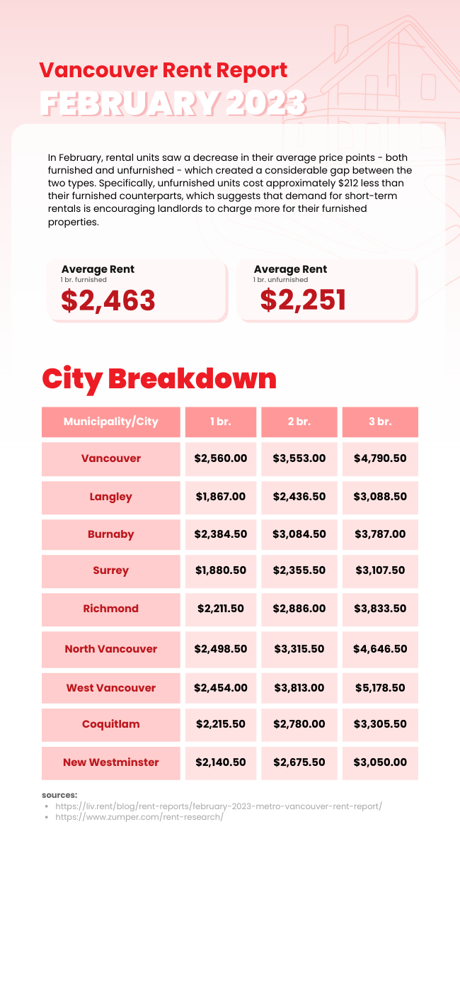 Metro Vancouver is an area with a wide range of rental rates. For example, West Vancouver had the highest prices for one, two and three-bedroom homes, both furnished and unfurnished, in consecutive months, while North Vancouver had the highest prices for furnished units. On the other hand, Coquitlam had the least expensive one-bedroom furnished units this February.