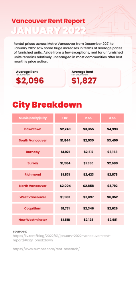 Rental prices across Metro Vancouver from December 2021 to January 2022 saw some huge increases in terms of average prices of furnished units. Aside from a few exceptions, rent for unfurnished units remains relatively unchanged in most communities after last month’s price action.