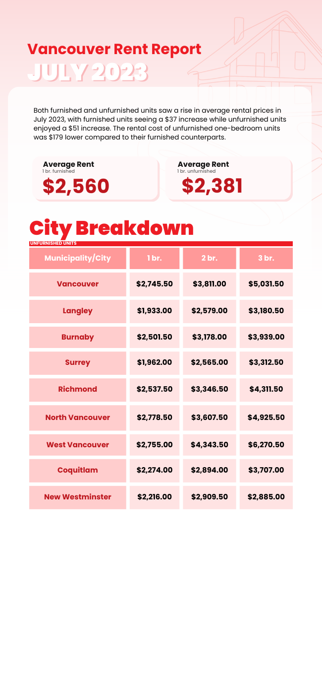 Rental prices in Metro Vancouver have seen yet another increase for the fourth consecutive month. In July, the average rent prices for unfurnished one-bedroom units across the region climbed by an additional $51 compared to the previous month, reaching an average cost of $2,381. Since July 2022, the average rent for unfurnished one-bedroom units in Metro Vancouver has seen a $352 increase.