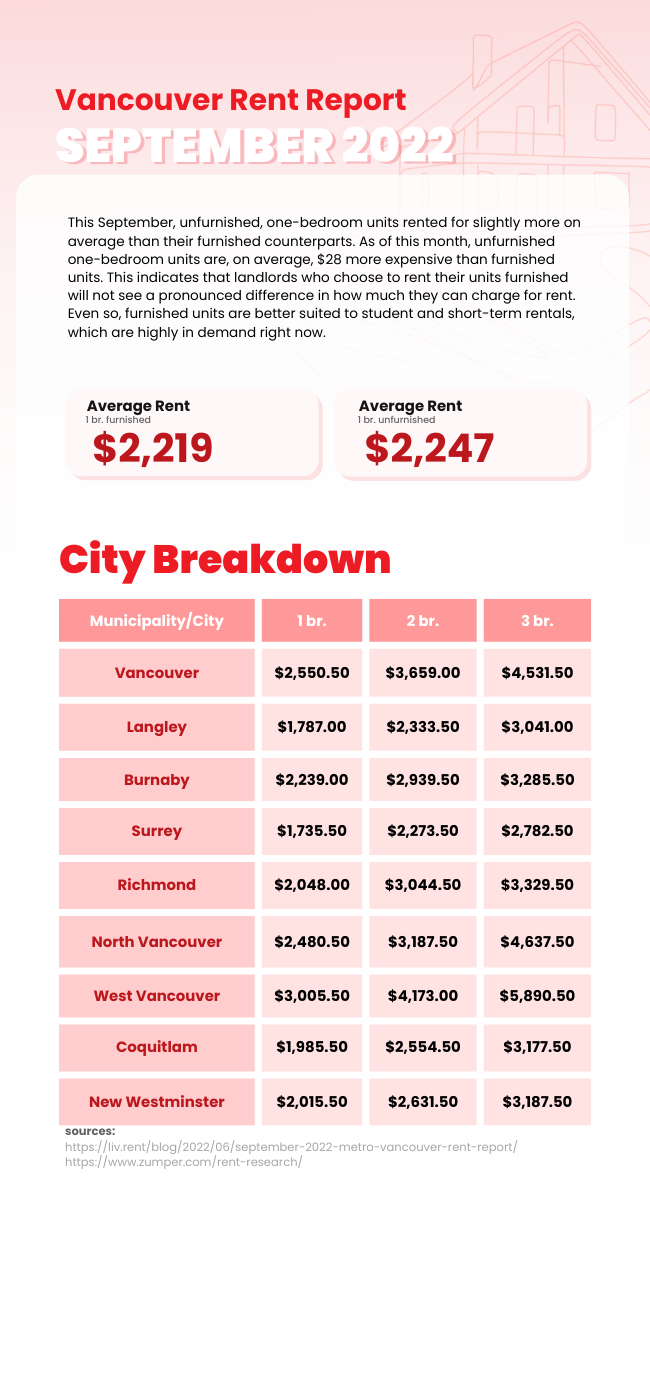 Metro Vancouver’s rental averages vary greatly across the region, so we’ve broken up our data by municipality/city to compare the cost of one-, two-, and three-bedroom rates for both furnished and unfurnished units in different areas.