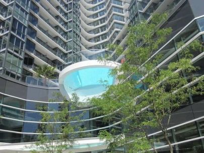 – Overhanging heated glass cantilever swimming pool