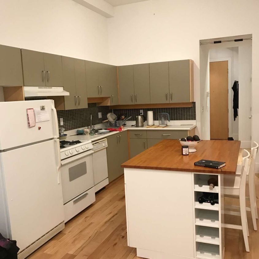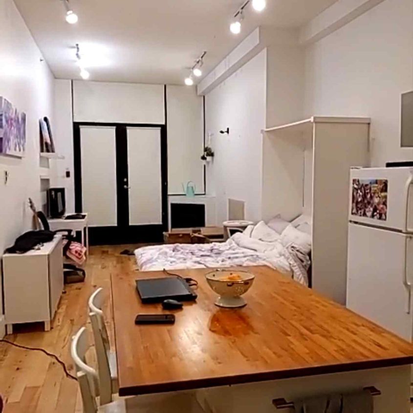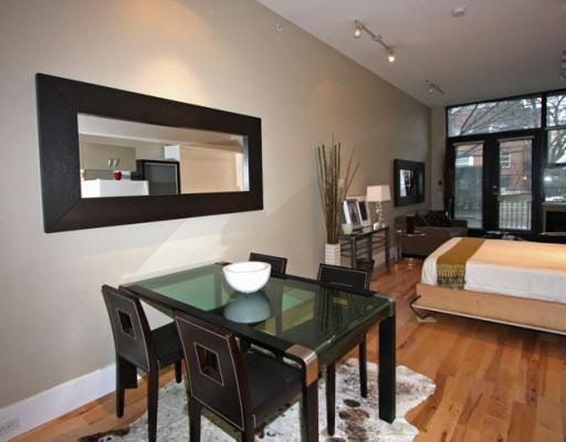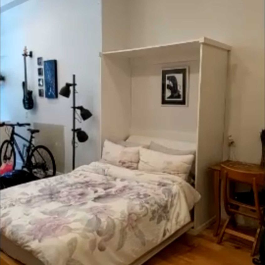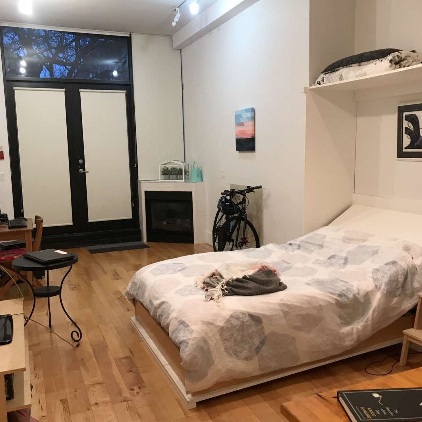 Very cool studio loft with 11 foot ceilings. Stunning hardwood floors and a totally renovated marble bathroom. 539 sq ft but seems much larger, built in Murphy bed tucks away to open up the living area. Private patio with French doors, great central location close to shopping, restaurants and parks. Secured underground parking.