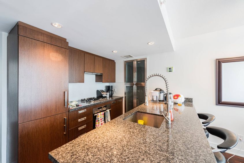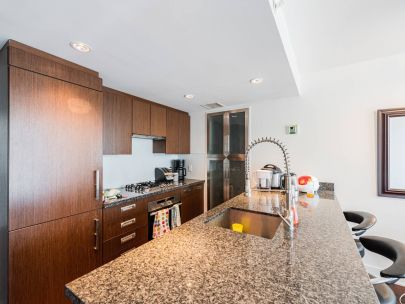 DONOVAN by Cressy! Live with comfort and safe in this tastefully furnished 2 bedroom condo with solarium. Enjoy your home complete with hardwood flooring, granite kitchen countertops and Miele appliance package. For enhanced comfort, the unit includes high-speed internet, cable and TV. Comes with 2 secured, side by side parking stalls.
