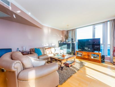 Corner suite, with wraparound floor to ceiling glass that highlights beautiful panoramic sights of the city and waters from the suite. Designated living and dining areas of an open flow layout take full advantage of these views and during the day, the suite is bathed in wonderful natural light. Elegant woodcraft furniture, light fixtures, and leather finishes provide both décor, function, and warmth throughout the residence. An adjoining open-faced kitchen provides for an inspiring space, with a gas cooktop, granite countertops, double door fridge, and fully stocked kitchen appliances and amenities. 2 private balconies expand upon and endorse the lofty views from the residence.